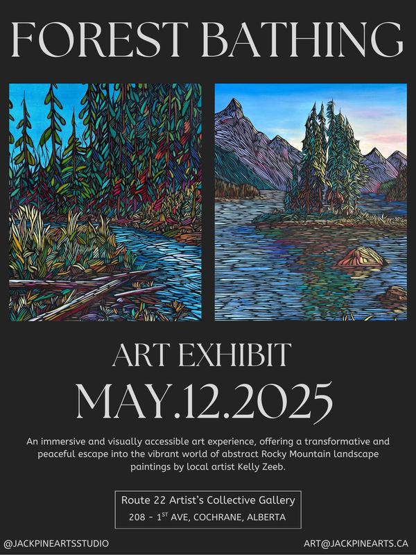 Kelly Zeeb’s first solo exhibition, Forest Bathing, was a resounding success, captivating visitors with its serene and immersive atmosphere. Hosted at Route 22 Artist’s Collective Gallery in Cochrane from May 12 to June 15, the show invited viewers to pause, breathe, and reconnect with the grounding beauty of nature. Inspired by her Canadian heritage and the legacy of the Group of Seven, particularly Lawren Harris, Zeeb used soft, cool palettes of blues, greens, and purples to create a calming, accessible environment for all viewers. Her thoughtful approach struck a chord with the community, as visitors enthusiastically supported this emerging local artist. Forest Bathing not only celebrated the power of nature through art but also offered a mindful and transformative experience.