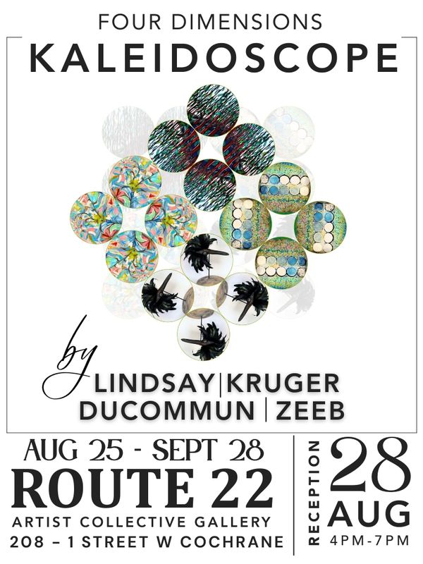 The 4 Dimensions “Kaleidoscope” Immersive Installation Exhibit marked the launch of an exciting new collaborative art experience, which brought together four unique creative voices. Kelly joined 3 other artists to create a group exhibition that celebrated both artistic diversity and the enduring beauty of nature. Zeeb’s contribution draws inspiration from the remarkable resilience and adaptability of Canadian pines such as: The White Pine’s Open-Minded flexibility, The Jack Pine’s Indomitable strength, and The Lodgepole Pine’s Versatile nature. This dynamic, immersive installation was the first group exhibit at Route 22 Gallery in Cochrane and was a notable success.